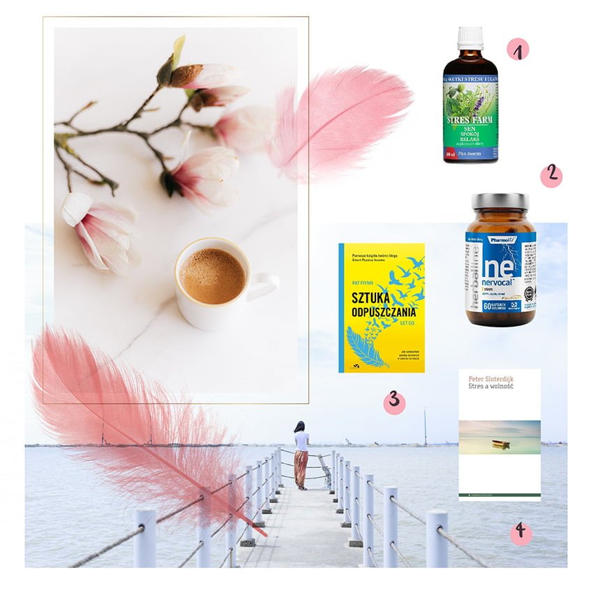 1. SUPLEMENT NA STRES Invent Farm | 2. SUPLEMENT DIETY Pharmovit | 3. KSIĄŻKA „Sztuka odpuszczania” P. Flynn | 4. KSIĄŻKA „Stres a wolność” P. Sloterdijk